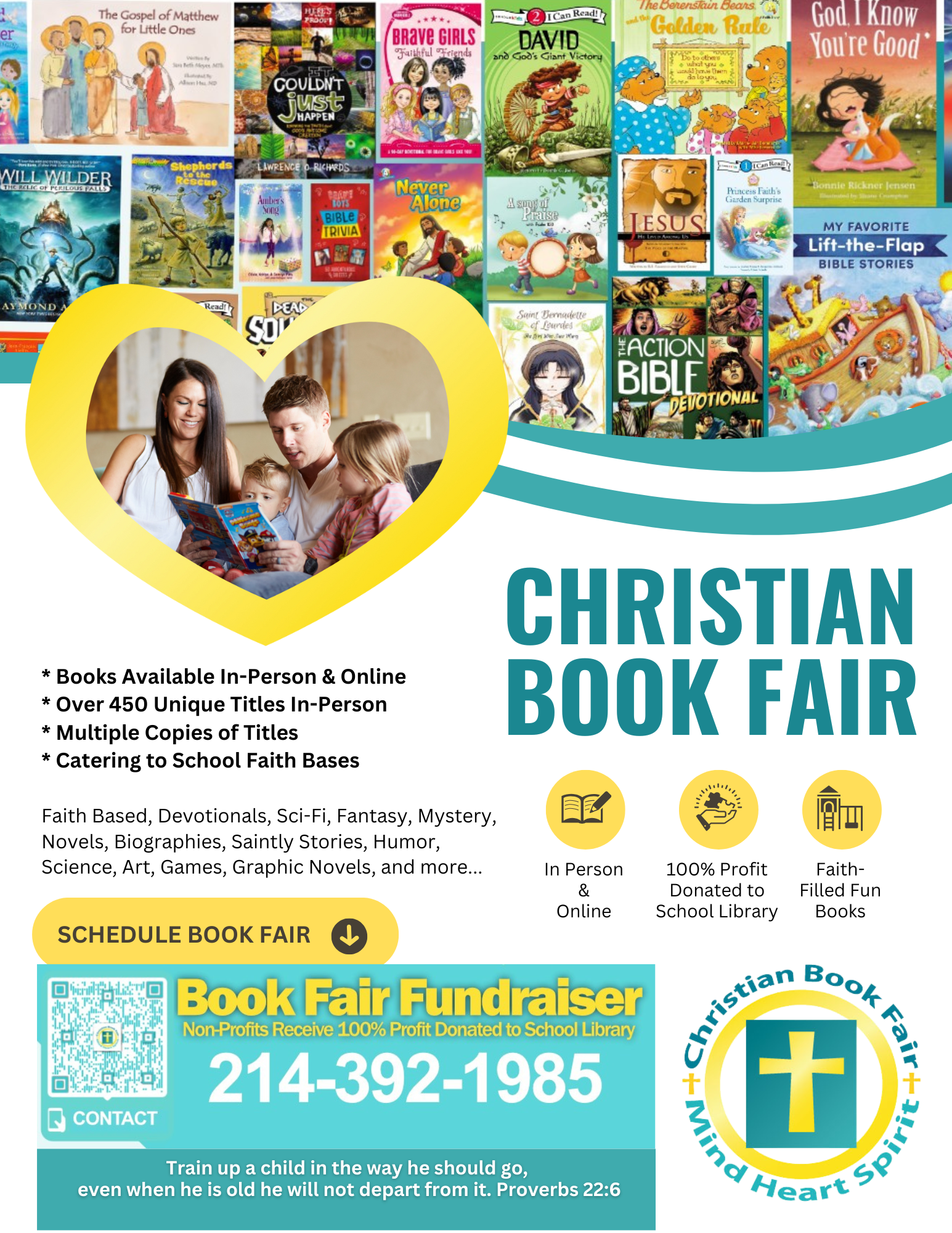 The 501(c)3 non-profit organization is dedicated to providing Christian books to inspire hearts, mind and Spirit. Please feel free to contact the Christian Book Fair regarding setting up a Book Fair and fundraiser for your school or ministry.